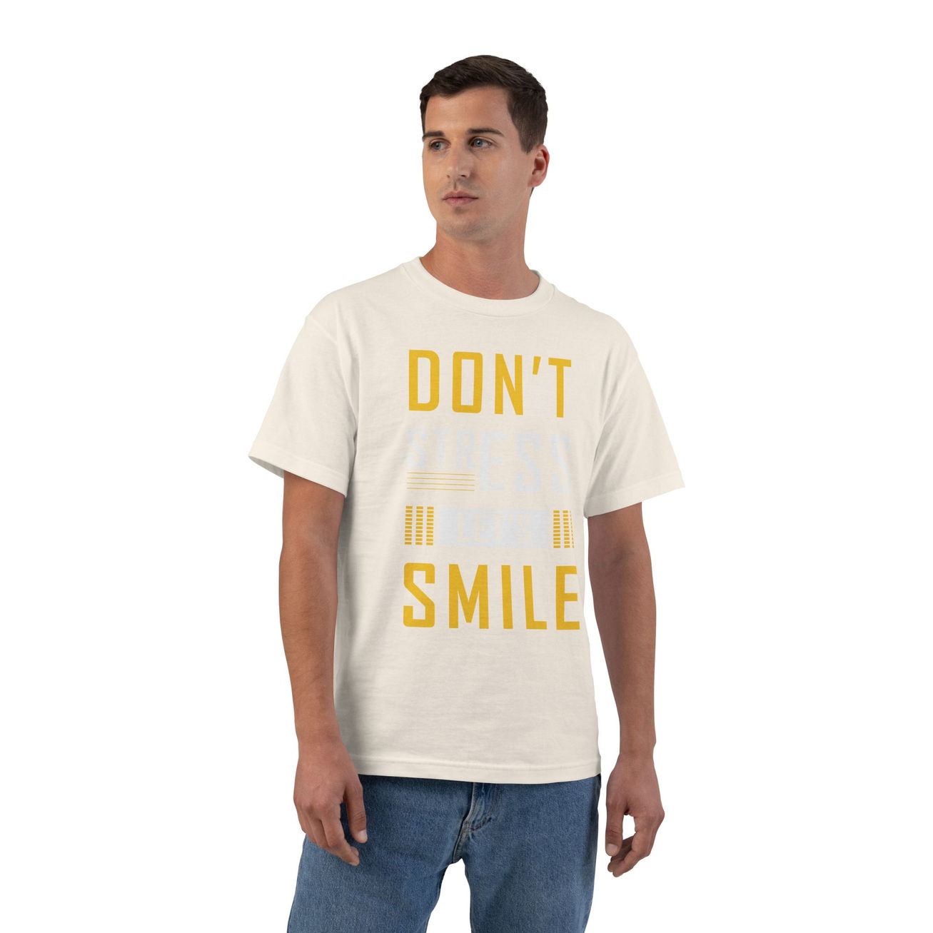 A relaxed, durable tee with bold, optimistic graphics that read “Don’t Stress Let’s Smile.” The fabric is smooth and sturdy, so the print stays vibrant through washes while the lay-flat collar and taped shoulders keep the silhouette crisp. Wear it to lift your own mood or to spark a friendly grin in a crowded commute. It pairs naturally with worn denim or layered under a cardigan for cool evenings — a casual go-to when you want comfort and a little upbeat attitude.