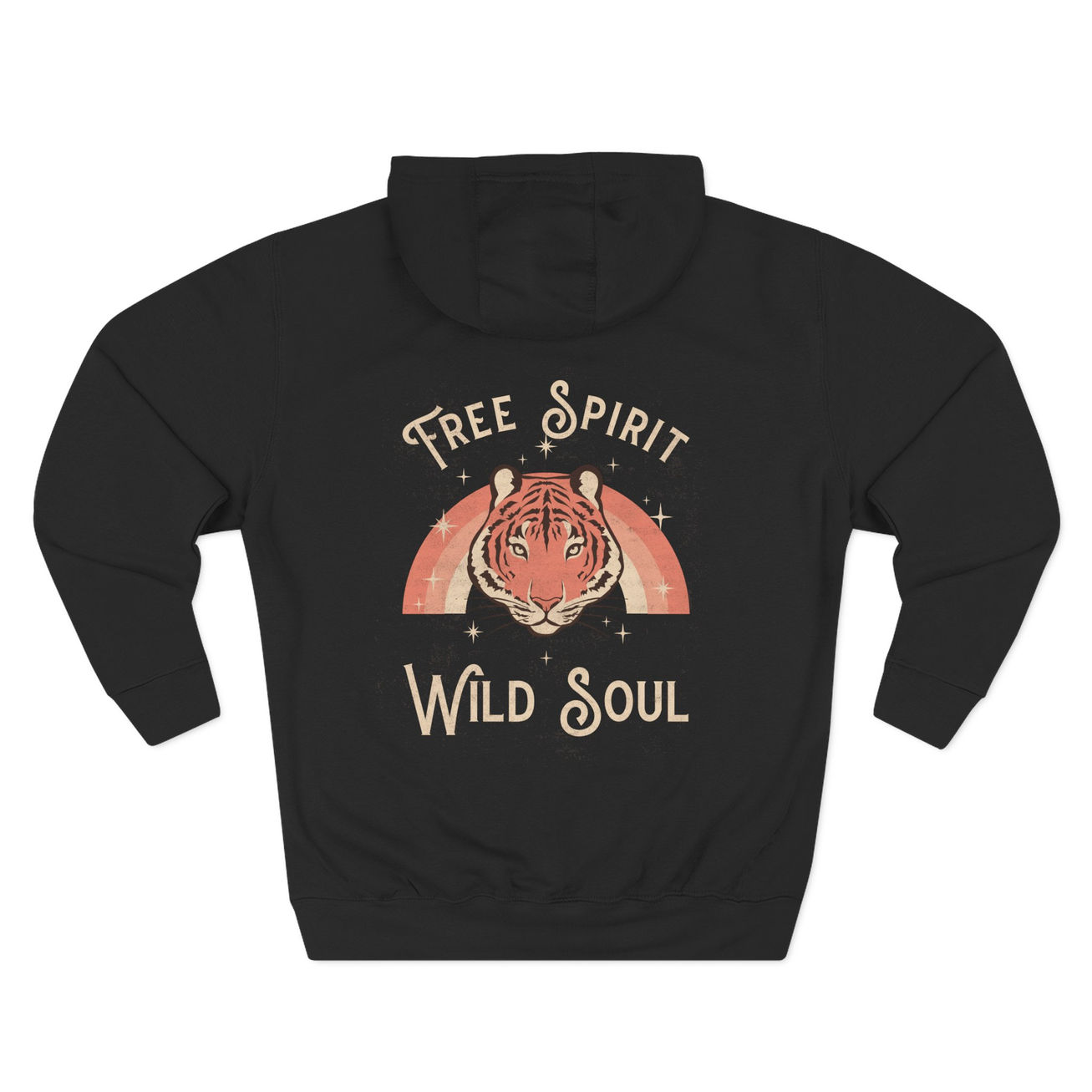 A cozy, mid-weight fleece hoodie that brings a vintage, free-spirited vibe to everyday wear. The soft three-end fleece and ring-spun cotton blend feel plush against the skin while the roomy kangaroo pocket and adjustable hood keep you warm on cool mornings or around the campfire. Subtle embroidery on the chest pairs with a bold back print featuring a tiger and retro sunburst with the phrase “Free Spirit • Wild Soul,” giving the hoodie an adventurous, lived-in look. Durable double-needle stitching and twill neck tape keep the shape over time, and a tear-away label ensures comfort. Wear it layered for road trips, outdoor gatherings, or slow weekend mornings.