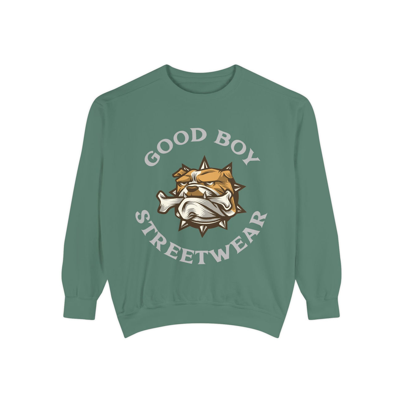This relaxed-fit garment-dyed sweatshirt brings laid-back streetwear energy with soft, lived-in comfort. The front showcases a bold embroidered bulldog mascot chewing a bone beneath arched “GOOD BOY STREETWEAR” lettering, giving the piece playful attitude without feeling loud. The medium-heavy ring-spun cotton blend drapes comfortably, the 1x1 ribbed collar, cuffs, and hem retain shape, and twill neck tape and a half-moon back patch add subtle, durable finishing touches. OEKO-TEX low-impact dyes give the washed color a muted, vintage look that keeps getting better with wear. Wear it layered over tees for chilly walks, to skatepark hangs, or as a statement piece for casual nights out—this sweatshirt feels like a loyal companion you reach for again and again.